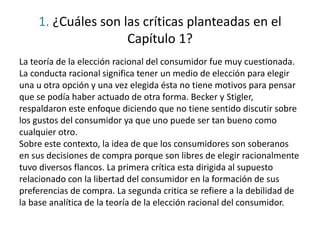 El documento discute la teoría de la elección racional del consumidor y las críticas a esta teoría. La primera crítica es que las preferencias de los consumidores no son completamente libres, sino que son influenciadas por la publicidad. La segunda crítica se refiere a la debilidad analítica de suponer que los consumidores toman decisiones de manera completamente racional. El documento también analiza el comportamiento real de los consumidores y cómo difiere del modelo de elección racional.