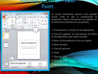Este documento explica los elementos básicos de la interfaz de PowerPoint, incluyendo la barra de herramientas de acceso rápido, la cinta de opciones, y cómo personalizar la barra de acceso rápido y ocultar/mostrar la cinta de opciones. También describe cómo crear una presentación en blanco o a partir de una plantilla, y recomienda descargar plantillas adicionales gratuitas desde Office.com.