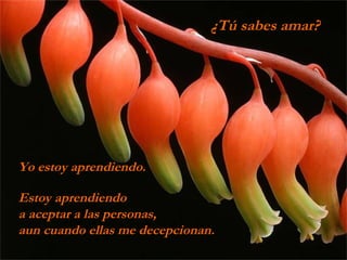 El documento habla sobre el proceso de aprendizaje para aceptar a las personas tal como son, a pesar de sus defectos o cuando decepcionan. También trata sobre aprender a escuchar con empatía más allá de las palabras, para comprender los verdaderos sentimientos y sufrimientos de los demás. Finalmente, menciona que está aprendiendo a perdonar y descubrir el valor interior de cada persona, aunque es un proceso lento y difícil amar incondicionalmente.