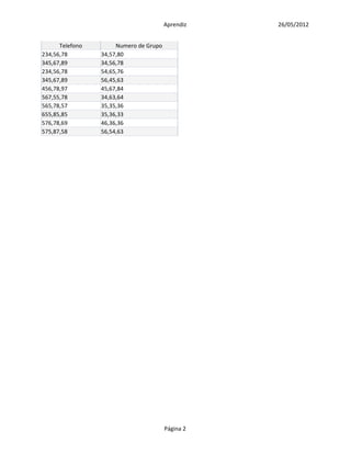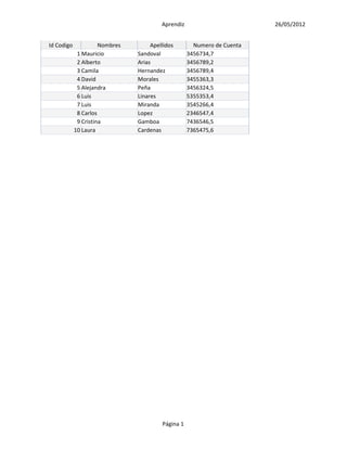 Este documento contiene una lista de 10 aprendices con sus respectivos datos como id, nombres, apellidos, número de cuenta, teléfono y número de grupo. La información se presenta en una tabla de dos páginas con columnas para cada dato.
