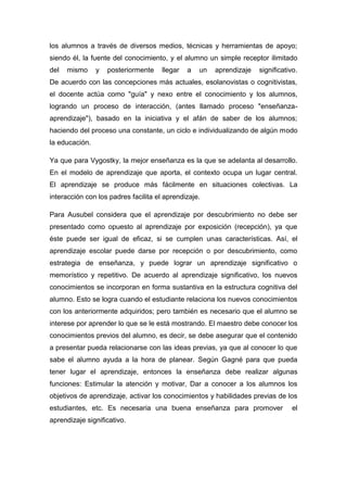 El documento habla sobre las teorías del aprendizaje de Vygotsky, Platón, Kneller y Ausubel. Explica que el aprendizaje es adquirir nuevos conocimientos a través de la experiencia y la instrucción, y que para Vygotsky ocurre en un contexto social. Define la educación como el proceso de transmitir valores y conocimientos entre generaciones. Finalmente, destaca que para lograr un aprendizaje significativo, como propone Ausubel, es importante considerar los conocimientos previos del estudiante y crear una relación entre lo nuevo y