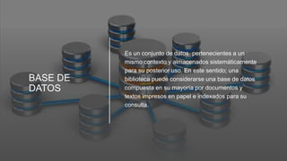 Este documento describe los conceptos fundamentales de las bases de datos, incluyendo las definiciones de base de datos, sistema de gestión de archivos, modelo ANSI-SPARC de tres niveles y diferentes tipos de modelos de bases de datos como jerárquico, relacional, de red y entidad-relación. Explica que una base de datos es un conjunto de datos almacenados sistemáticamente y un sistema de gestión es el software interfaz entre usuarios, aplicaciones y la base de datos.