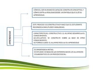 Este documento describe tres factores clave que afectan el aprendizaje: el factor cognitivo que incluye procesos mentales como percibir, observar, analizar y sintetizar; el factor afectivo social que involucra sentimientos, actitudes y motivación; y el factor ambiental y de organización que se refiere al espacio, tiempo y administración del estudio. También explica que aprender a aprender implica desarrollar habilidades para interpretar información, planear actividades y evaluar conocimientos adquiridos usando estrategias metac