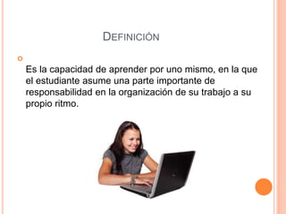 El aprendizaje autónomo permite que los estudiantes asuman responsabilidad en la organización de su trabajo a su propio ritmo. Requiere respeto, autodisciplina, responsabilidad y compromiso consigo mismo y la sociedad. Ofrece ventajas como trabajar por su cuenta, no asistir a clases presenciales y prepararse para el aprendizaje a lo largo de la vida, pero requiere condiciones como un sistema intenso de tutoría, preparación del estudiante y actitud positiva de profesores y estudiantes.