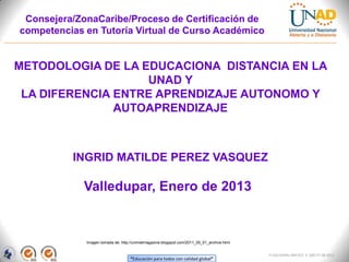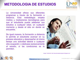 Este documento describe la metodología de educación a distancia utilizada por la Universidad Nacional Abierta y a Distancia de Colombia (UNAD). Explica que la UNAD ofrece programas a través de formación a distancia con medios tecnológicos que permiten a los estudiantes aprender desde cualquier lugar. También distingue entre aprendizaje autónomo, donde los estudiantes asumen la iniciativa de su aprendizaje, y autoaprendizaje, que implica aprender de manera independiente buscando uno mismo la información.