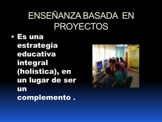 El documento describe diferentes aspectos del aprendizaje basado en proyectos. Señala que utilizar proyectos como parte del currículo escolar no es un concepto nuevo y que los maestros los incorporan con frecuencia. Además, explica que el aprendizaje basado en proyectos es una estrategia educativa integral en lugar de un complemento y que el trabajo por proyectos es una parte importante del proceso de aprendizaje, especialmente en la sociedad actual. Finalmente, indica que cuando se habla de aprendizaje por proyectos, se refiere a actividades con