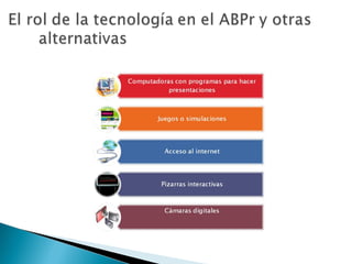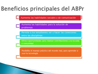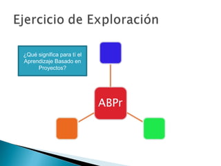 1) El documento presenta información sobre un taller sobre aprendizaje basado en proyectos (ABPr). 2) El taller busca que los participantes comprendan las bases teóricas y componentes del modelo ABPr y ensayen el desarrollo de un proyecto desde esta perspectiva. 3) También incluye definiciones de ABPr, sus principios constructivistas y estrategias de enseñanza efectivas como la problematización.