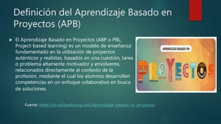 El aprendizaje basado en proyectos (ABP) es un modelo de enseñanza fundamentado en la utilización de proyectos auténticos y realistas relacionados al contexto profesional, mediante los cuales los estudiantes desarrollan competencias de forma colaborativa. Los pasos para realizar el ABP incluyen identificar un reto, investigarlo, explorar ideas colaborativamente, desarrollar un producto y compartirlo. El rol del profesor es administrar las actividades, brindar apoyo e inspiración, y evaluar el apre