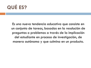 El aprendizaje basado en proyectos es un enfoque educativo en el que los estudiantes resuelven preguntas o problemas a través de una investigación autónoma que culmina en un producto. Los estudiantes aplican sus conocimientos para resolver problemas de manera independiente, generando preguntas, debatiendo ideas y recolectando datos para establecer conclusiones. Este método permite que los estudiantes aprendan en contextos del mundo real más allá del aula y tiene ventajas como centrarse en conceptos principales, implicar a los estudiantes en la solución