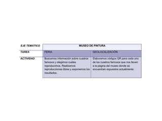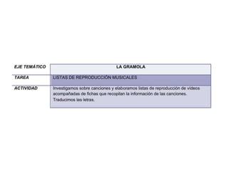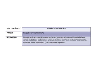 El documento se centra en el conocimiento aplicado en la educación, enfatizando el aprendizaje basado en competencias y la importancia de las tareas contextualizadas en lugar de ejercicios descontextualizados. Se presentan métodos para fomentar la utilización de las TIC, el trabajo en equipo y la creatividad entre los alumnos, así como ejemplos de actividades que integran contenidos curriculares. Además, se destacan criterios de evaluación y rúbricas para medir el desempeño y progreso del alumnado en proyectos grupales.