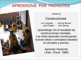 El documento describe los principios del aprendizaje por proyectos según teóricos constructivistas como Vygotsky y Dewey. Explica que los estudiantes aprenden construyendo nuevas ideas basadas en experiencias previas. Luego, detalla los elementos clave de un proyecto, como que esté centrado en el estudiante, aborde problemas del mundo real y permita evaluaciones auténticas. Finalmente, resalta los beneficios de esta metodología como aumentar la motivación de los estudiantes y permitirles desarrollar habilidades para la vida.