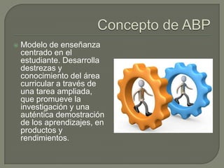 El documento describe el concepto de aprendizaje basado en proyectos (ABP), el cual es un modelo de enseñanza centrado en el estudiante que desarrolla destrezas y conocimientos a través de tareas ampliadas que promueven la investigación y demostración de aprendizaje. Las características clave de los proyectos incluyen que los estudiantes son el centro del proceso de aprendizaje, involucran evaluaciones continuas y conexiones con el mundo real. La planificación de proyectos implica determinar metas de aprend