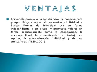 El aprendizaje colaborativo promueve la construcción de conocimiento a través de la activación del pensamiento individual y la investigación independiente o en grupo, y fomenta valores como la cooperación, responsabilidad, comunicación y trabajo en equipo; también mejora la comunicación entre personas al generar un lenguaje común y establecer normas de grupo que disminuyen el temor a la crítica y aislamiento.