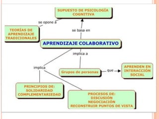 El aprendizaje colaborativo tiene ventajas como promover la construcción de conocimiento a través del pensamiento individual y grupal, y valores como la cooperación; también mejora la comunicación y las relaciones interpersonales. Algunas desventajas son la necesidad de asegurar que los participantes desarrollen las actitudes adecuadas y se adapten a la dinámica grupal, y que los grupos sean pequeños de 3 a 5 personas para ser efectivos. El tutor debe facilitar el ambiente para el aprendizaje y estimular la retroalimentación entre los estudiantes.