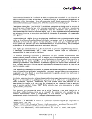 El documento describe el aprendizaje colaborativo/cooperativo. Explica que este método de aprendizaje enfatiza el trabajo en equipo y la interacción entre estudiantes y profesores, donde el conocimiento es construido socialmente. También describe elementos clave como la interdependencia positiva entre los miembros del grupo y la división de tareas de acuerdo a las fortalezas individuales, con el objetivo de lograr metas grupales. Finalmente, señala que este método se alinea con teorías como las de Piaget y Vygotsky sobre el des