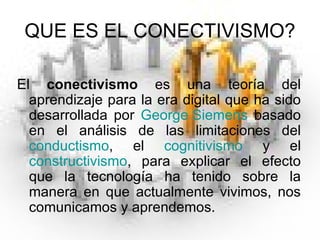 Este documento describe las teorías del aprendizaje del conductismo, cognitivismo, constructivismo y conectivismo. Explica que el conectivismo es una teoría del aprendizaje desarrollada por George Siemens que considera cómo la tecnología ha afectado la forma en que vivimos, nos comunicamos y aprendemos en la era digital. También compara brevemente estas teorías del aprendizaje y describe algunos de sus principios clave.