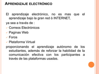 El documento describe el aprendizaje electrónico, que incluye el aprendizaje a través de Internet utilizando correos electrónicos, páginas web, foros y plataformas virtuales. Existen dos tipos principales: e-learning, que es totalmente virtual, y b-learning, que combina la educación a distancia y presencial. Las ventajas del aprendizaje electrónico son que proporciona recursos didácticos diversos, apoyo tutorial, mejora la comunicación y elimina barreras espacio-temporales. La mejor metodología