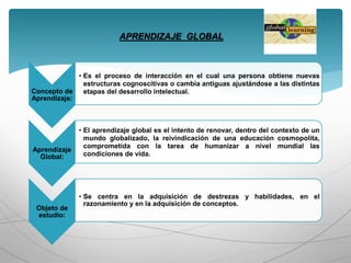 El documento trata sobre diferentes temas relacionados con el aprendizaje global y los estilos de aprendizaje. Brevemente: 1) Define el aprendizaje global como un intento de renovar la educación en un mundo globalizado para humanizar las condiciones de vida a nivel mundial; 2) Examina teorías del aprendizaje como el conductismo, el constructivismo, el cognitivismo y el conectivismo; 3) Distingue entre tipos de aprendizaje como el receptivo, por descubrimiento, repetitivo y significativo; 4) Describe est