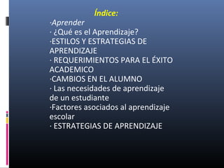 Este documento trata sobre el aprendizaje y proporciona información sobre varios temas relacionados como los estilos y estrategias de aprendizaje, los requisitos para el éxito académico, y los factores que afectan el aprendizaje escolar. Explica conceptos clave como qué es el aprendizaje, las necesidades de aprendizaje de los estudiantes, y las estrategias que pueden usar para mejorar su aprendizaje. El objetivo general es brindar una guía sobre el proceso de aprendizaje y cómo los estudiant
