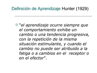 Este documento presenta una revisión de las diferentes teorías del aprendizaje a lo largo de la historia. Comienza describiendo las teorías conductistas como las de Hunter, Pavlov y Skinner, que enfocan el aprendizaje como cambios en la conducta. Luego presenta teorías cognitivas como las de Piaget, Bruner y Vigotsky, que ven el aprendizaje como la adquisición de estructuras cognitivas. Finalmente, contrasta las perspectivas conductista y cognitiva, resaltando que las teorías cognitivas enfatizan