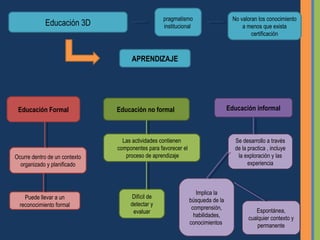 El documento compara las perspectivas de John Dewey en 1938 y John Seely Brown en 2008 sobre la educación y el aprendizaje. Ambos reconocen la necesidad de pensar nuevas formas de enseñar y aprender que trasciendan el contexto formal. Seely Brown enfatiza la importancia de crear, reflexionar y compartir conocimiento entre pares, aprovechando nuevos medios digitales que permiten el aprendizaje ubicuo y permanente.