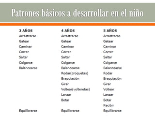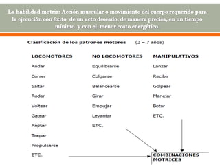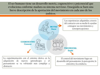 El documento describe el proceso de desarrollo motor en los seres humanos. Explica que el desarrollo motor implica la evolución de la capacidad de movimiento y depende de factores como la maduración neurológica y el crecimiento corporal. Describe las diferentes fases del desarrollo motor desde los movimientos reflejos de los primeros meses hasta la adquisición de habilidades motoras básicas y específicas a lo largo de la vida.