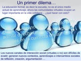 Este documento discute el tema de la formación en línea y el aprendizaje informal a través de las nuevas tecnologías. Señala que la educación formal ya no es el único medio de aprendizaje debido al papel cada vez más importante de las comunidades virtuales. Plantea el dilema de si incluir o no estas tecnologías móviles en los planes de estudio formales. Finalmente, cita a un académico finlandés que argumenta que si se aceptaran estas tecnologías, lo más probable es que cambie la mentalidad de los