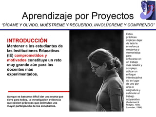 Este documento describe el aprendizaje por proyectos, una estrategia educativa que involucra a los estudiantes en proyectos del mundo real. Explica que este enfoque motiva a los estudiantes y mejora su compromiso. También destaca los principales beneficios, como desarrollar habilidades para el trabajo y aumentar la motivación y autoestima de los estudiantes.
