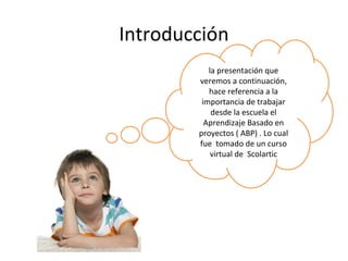 El documento discute la importancia del aprendizaje basado en proyectos (ABP) en el contexto educativo, destacando cómo fomenta el trabajo en equipo diverso y prepara a los estudiantes para una economía global. Resalta la transición necesaria de un paradigma centrado en la transmisión de contenidos a uno que permita la construcción activa del conocimiento. Además, menciona la capacitación educativa proporcionada por un curso virtual que busca una educación integral y contextualizada.