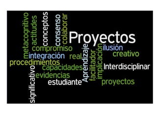 Este documento describe la metodología de aprendizaje basada en proyectos. Explica las cinco fases del método de proyectos propuesto por Dewey que incluyen identificar un problema real, analizar datos, buscar soluciones y comprobar hipótesis a través de la acción. También cubre tipos de proyectos, cómo diseñarlos teniendo en cuenta objetivos y actividades, y las fases de planeación, realización y cierre de un proyecto.
