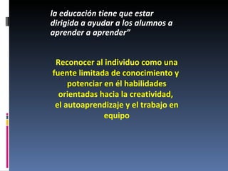 El documento trata sobre el aprendizaje y la enseñanza. Explica que el aprendizaje es un proceso activo de construcción de conocimiento por parte del estudiante. También describe que el rol del profesor debe cambiar de ser el transmisor de información a ser el facilitador del aprendizaje del estudiante. Además, señala que el estudiante debe pasar de ser un receptor pasivo a ser un participante activo en la construcción de su propio conocimiento.