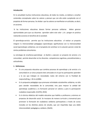Este documento describe el aprendizaje-servicio como una estrategia educativa que combina el aprendizaje con el servicio a la comunidad. Explica que tiene una doble intencionalidad de mejorar la comunidad y promover el aprendizaje de los estudiantes. También detalla las etapas clave de un proyecto de aprendizaje-servicio, que incluyen la motivación, diagnóstico, diseño, ejecución y cierre, así como procesos transversales como la reflexión y sistematización. El objetivo general es que los