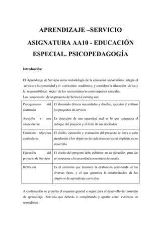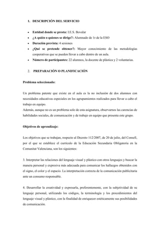 El documento describe un proyecto de aprendizaje-servicio realizado con alumnos de 1o de la ESO. El proyecto consistió en 4 sesiones en las que se utilizaron técnicas de aprendizaje cooperativo como "expertos" para enseñar diferentes contenidos. Las sesiones ayudaron a los alumnos a desarrollar habilidades sociales y de trabajo en equipo mientras aprendían los contenidos académicos. El proyecto resultó una experiencia positiva que permitió poner en práctica conceptos pedagógicos.