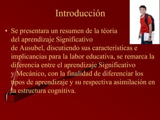 La teoría del aprendizaje significativo de Ausubel distingue entre aprendizaje significativo y mecánico. El aprendizaje significativo ocurre cuando el material nuevo se puede relacionar de manera sustancial con conceptos relevantes ya existentes en la estructura cognitiva del estudiante. Ausubel identifica tres tipos de aprendizaje significativo: aprendizaje de representaciones, conceptos y proposiciones. El principio de asimilación se refiere a la interacción entre la nueva información y la estructura cognitiva existente, lo que da