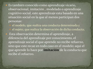 El aprendizaje social o vicario se produce a través de la observación y la imitación de modelos. Bandura destacó cuatro factores que influyen en este proceso: la atención, la retención, la reproducción y la motivación. Realizó experimentos como el del "muñeco bobo" que demostraron que los niños pueden aprender nuevas conductas a través de la observación sin refuerzo directo.