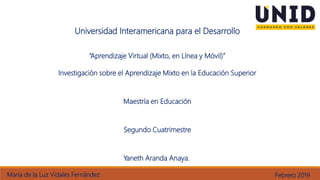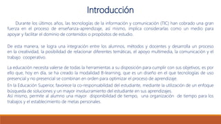 El documento describe la modalidad de aprendizaje mixto (b-learning) en la educación superior. Explica que el b-learning combina la enseñanza presencial con recursos virtuales para optimizar el aprendizaje. Ofrece ventajas como flexibilidad horaria, disponibilidad geográfica y actualización de contenidos. Sin embargo, también presenta desafíos como la resistencia al cambio y dependencia de la tecnología. Concluye que esta modalidad permite potenciar el aprendizaje de los estudiantes universitarios al integrar lo mejor del