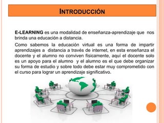 El documento describe el aprendizaje virtual (e-learning) y los roles de los docentes y estudiantes en este contexto. Explica que el e-learning permite la educación a distancia a través de Internet, con el docente brindando apoyo y el estudiante organizando su propio aprendizaje de manera independiente. También detalla las funciones y habilidades necesarias de los docentes-tutores virtuales como generar diálogo, organizar materiales y monitorear el progreso de los estudiantes.