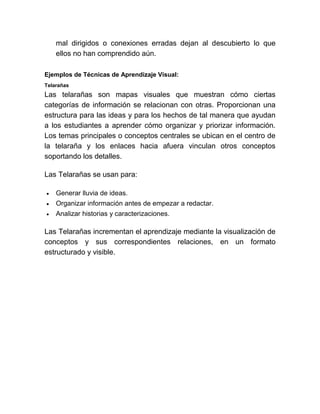 El documento describe las ventajas del aprendizaje visual y algunas técnicas como telarañas, mapas de ideas y mapas conceptuales. El aprendizaje visual ayuda a los estudiantes a clarificar su pensamiento, reforzar la comprensión, integrar nuevo conocimiento e identificar conceptos erróneos. Estas técnicas organizan la información de forma visual para facilitar el aprendizaje.