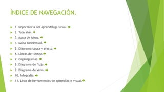 Este documento describe diferentes herramientas de aprendizaje visual como telarañas, mapas conceptuales, diagramas de flujo y líneas de tiempo. Explica que estas herramientas sirven para que los estudiantes organicen y procesen información de manera gráfica, lo que ayuda a clarificar ideas y fortalecer la comprensión. También incluye enlaces a sitios web donde se pueden crear diferentes tipos de representaciones visuales.