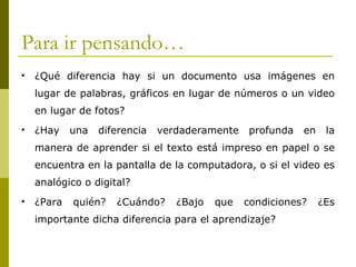 Este documento discute el impacto de las tecnologías de la información y la comunicación (TIC) en el aprendizaje. Señala que las TIC están transformando las formas de acceso al conocimiento, las maneras de aprender, las comunicaciones y las relaciones personales. También plantea preguntas sobre si los estudiantes aprenden de manera diferente con las TIC y si las escuelas pueden adaptarse a los nuevos escenarios tecnológicos. Finalmente, argumenta que aunque el medio no determina necesariamente el aprendizaje, las comput