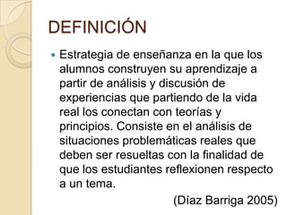 El documento describe el aprendizaje basado en casos, una estrategia de enseñanza en la que los estudiantes analizan y discuten experiencias de la vida real para conectarlas con teorías. Los casos plantean situaciones problema que los estudiantes deben resolver. El docente guía el análisis y promueve la reflexión crítica, mientras que los estudiantes participan activamente, respetan las opiniones de los demás y aportan investigaciones individuales.