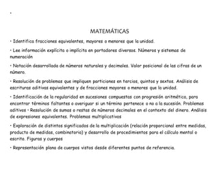 El documento presenta aprendizajes clave en varias materias como español, matemáticas, geografía, ciencias naturales, historia y formación cívica y ética. Los aprendizajes incluyen habilidades como formular preguntas para buscar información, identificar fracciones equivalentes, reconocer la localización de México en mapas, explicar la importancia de una dieta balanceada y las vacunas, ubicar el proceso de poblamiento de América, y distinguir en quién se puede confiar.