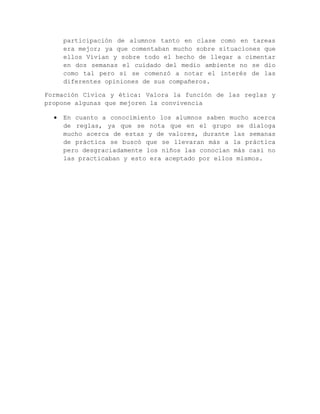El documento resume los aprendizajes esperados con el enfoque por competencias en diferentes asignaturas. En Español, los estudiantes identifican información sobre temas mediante preguntas y lecturas. En Matemáticas, describen y crean sucesiones de figuras y objetos mediante observación y análisis. En Exploración de la naturaleza y la sociedad, reconocen la importancia de la naturaleza para satisfacer necesidades humanas a través de ejemplos cotidianos. En Formación Cívica y ética, valoran las reglas a