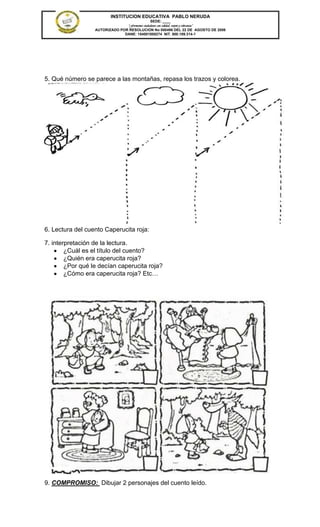 Este documento contiene varias fichas de aprendizaje para estudiantes de primaria. Las fichas incluyen ejercicios de trazos, coloreado, lectura de cuentos infantiles y su interpretación, y desarrollo de habilidades espaciales como la direccionalidad y las posiciones relativas de objetos. El objetivo general es desarrollar habilidades motrices finas y comprensión lectora en estudiantes de nivel inicial.