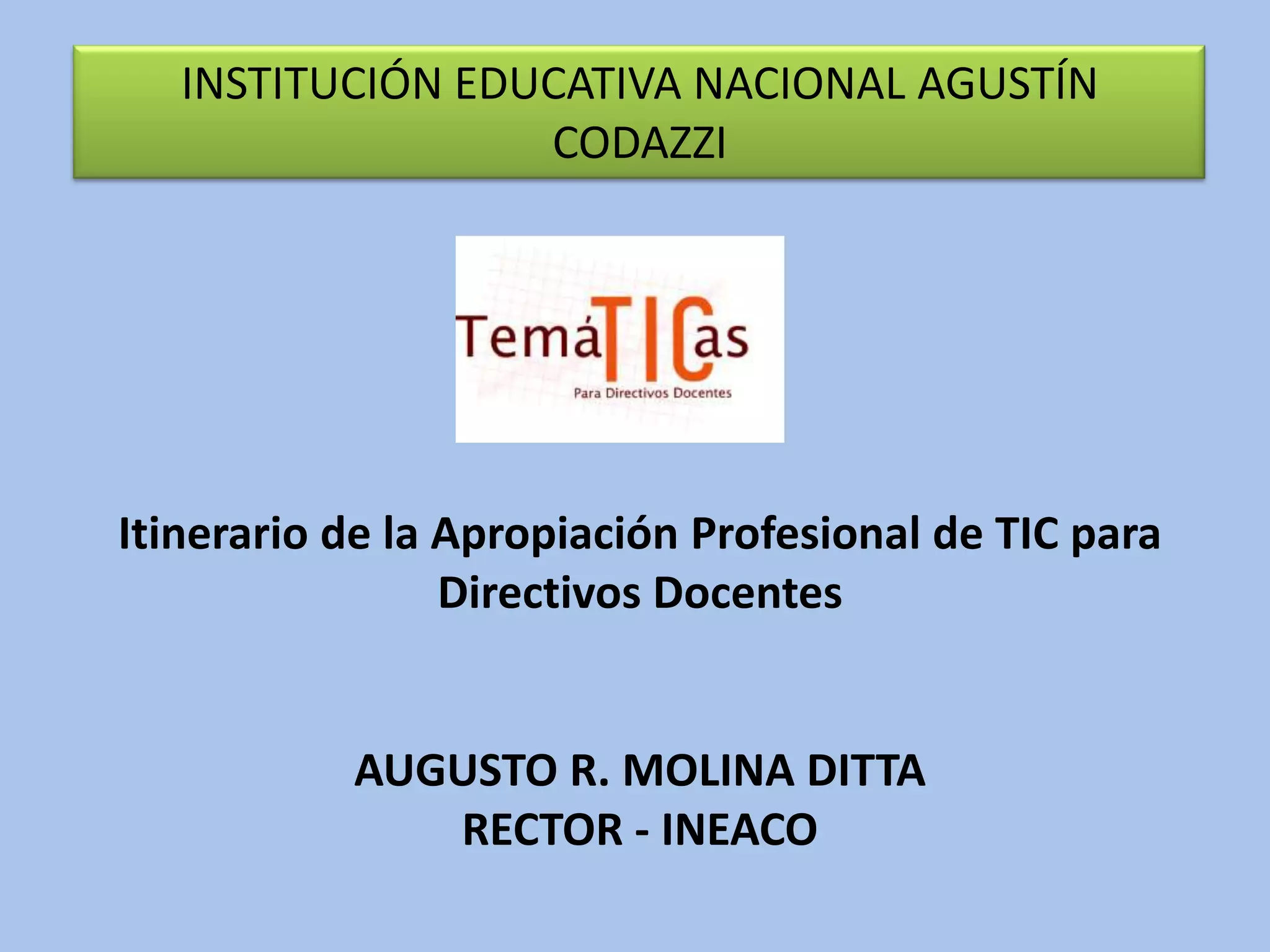 Este documento presenta el itinerario de la apropiación profesional de TIC para directivos docentes de la Institución Educativa Nacional Agustín Codazzi. El itinerario contiene 5 temáticas que abordan el rol de los directivos como actores del cambio e impulsores del uso de TIC en la gestión institucional. El objetivo es mejorar los procesos directivos, académicos y administrativos a través de la implementación de herramientas tecnológicas.