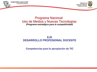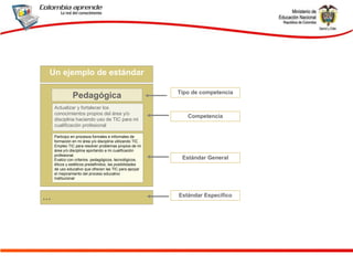 El documento presenta las competencias esperadas para que los docentes colombianos apropien las tecnologías de la información y la comunicación (TIC) con sentido pedagógico. Define cuatro tipos de competencias (técnicas y tecnológicas, pedagógicas, comunicativas y colaborativas, y éticas) y establece estándares generales para cada una. Además, describe el proceso de validación y alineación con referentes nacionales e internacionales para definir estas competencias docentes en el uso de TIC.