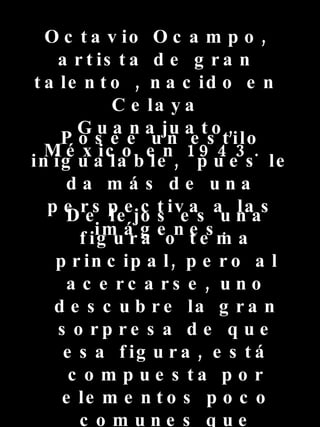 Este documento describe al artista mexicano Octavio Ocampo, nacido en 1943 en Celaya, Guanajuato. Ocampo tiene un estilo único en el que las imágenes pueden verse de diferentes perspectivas, mostrando figuras u objetos desde lejos pero revelando detalles adicionales al acercarse. El documento enumera varias de las obras de Ocampo.