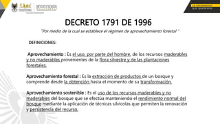 Este documento define los tipos de aprovechamiento forestal y establece el régimen para su realización de acuerdo con el Decreto 1791 de 1996. Se definen aprovechamiento forestal único, persistente y doméstico. El aprovechamiento forestal requiere permisos y autorizaciones de acuerdo con el tipo de bosque y terreno, y debe realizarse de manera sostenible mediante el uso de técnicas silvícolas.
