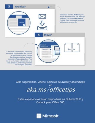 Este documento proporciona instrucciones para organizar la bandeja de entrada de Outlook mediante el acortamiento de hilos de correo largos, la limpieza de mensajes eliminados ya leídos, el ignorar conversaciones futuras para enviarlas directamente a la carpeta de elementos eliminados, y la capacidad de archivar conversaciones o mensajes individuales moviéndolos a la carpeta de archivo o creando y moviendo mensajes a carpetas personalizadas.