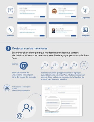 Este documento presenta 5 maneras de aprovechar todo el potencial de Outlook: 1) crear firmas personalizadas, 2) destacar mensajes con menciones usando el símbolo @, 3) trabajar de manera conjunta en archivos adjuntandolos a mensajes y cargándolos en OneDrive, 4) crear avisos para recordar tareas usando la función de agregar aviso, y 5) obtener más sugerencias y ayuda usando la función "¿Qué desea hacer?" en Outlook.